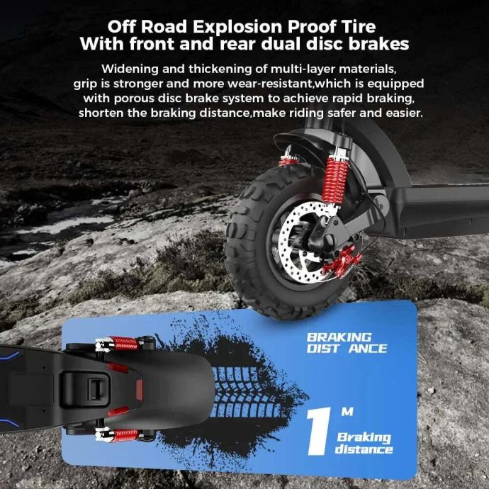 Prodajem iScooter iX6 električni skuter, vrhunski model koji dolazi s 11-inčnim pneumatskim off-road gumama koje odlično upijaju udarce i omogućuju glatku vožnju po gradu, makadamu i zahtjevnijem terenu. Pokreće ga snažan stražnji motor od 1000W, koji pruža brzo ubrzanje i bez problema savladava uzbrdice, uz maksimalnu brzinu do 45 km/h. Zahvaljujući 48V 17.5Ah bateriji dugog dometa, skuter može prijeći do 45 km s jednim punjenjem, što ga čini idealnim za duže rute i svakodnevne vožnje. Izrađen je od kvalitetnog aluminijskog okvira, izgleda moderno i izdržljivo, a dvojni disk kočioni sustav osigurava snažno i precizno kočenje na svim podlogama.