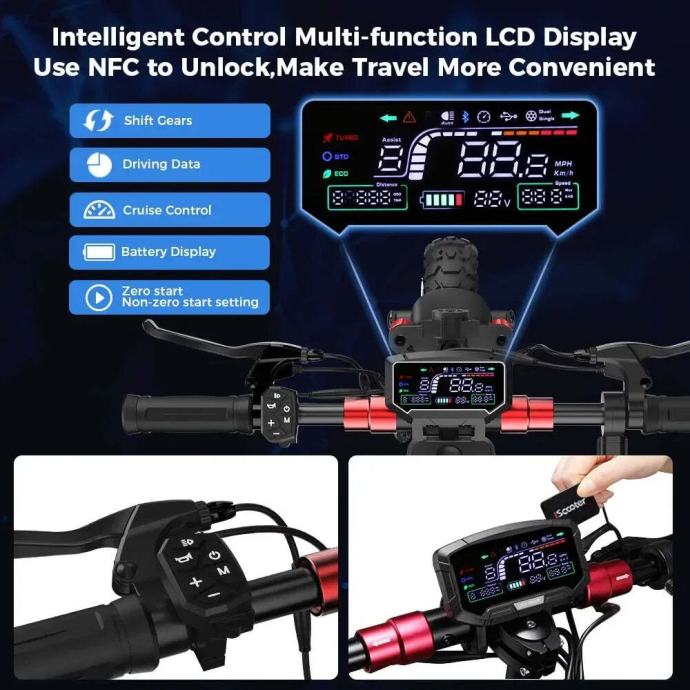 Skuter ima veliki, pregledni LCD ekran u boji koji jasno prikazuje brzinu, bateriju, odabrani način vožnje, svjetla i sve bitne informacije čak i na jakom suncu. Upravljanje je jednostavno — sve komande su pod rukom, a ručice su ergonomske i kvalitetne, što dodatno doprinosi osjećaju kontrole. Kao dodatna sigurnosna značajka, iX6 koristi NFC otključavanje, pa skuter ne može upaliti nitko tko nema karticu — odlična zaštita protiv krađe.