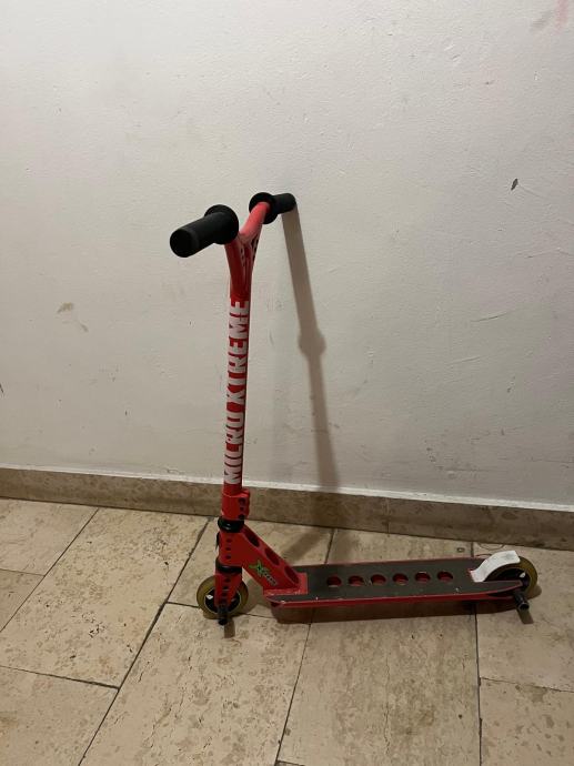 Micro romobil za akrobacije, crvene boje, snažan, lagan i izdržljiv. Kotači s čeličnim felgama, izuzetno odzivne kočnice i lagani stalak. Preporučena dob od 5 godina nadalje.