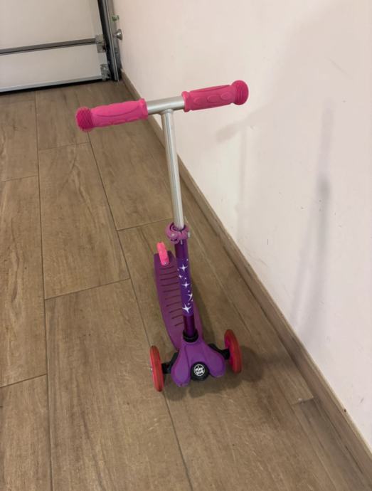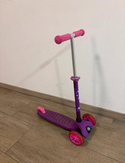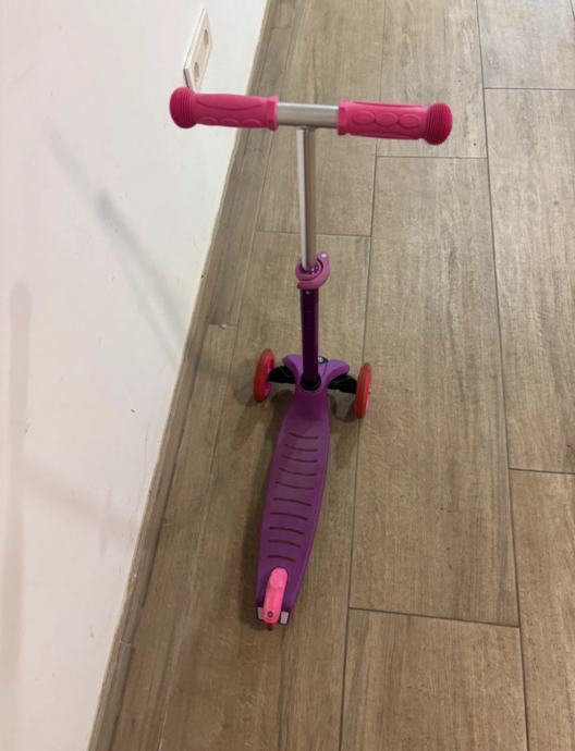 Prodajem rabljeni dječji romobil u ljubičasto-rozoj boji, idealan za mlađe uzraste. Romobil ima tri kotača što ga čini stabilnim i sigurnim za djecu koja tek uče voziti. Upravljačka šipka je podesiva po visini, što omogućava duže korištenje kako dijete raste.