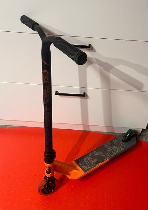 Prodajem rabljeni romobil u narančasto-crnoj kombinaciji boja. Radi se o stunt romobilu s grafičkim uzorkom na upravljaču i dasci. Upravljač je s gumenim hvataljkama jako malo korišten