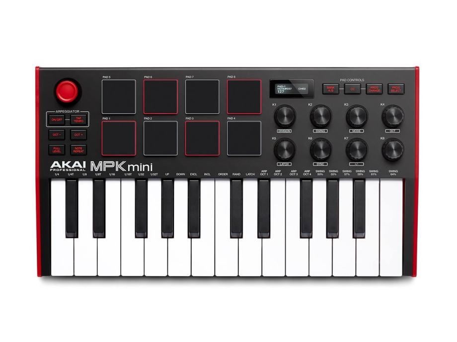 Akai MPK mini MK3 je dovoljno mali kontroler da stane u ruksak. ovaj MIDI kontroler se napaja preko USB-a. Sadrži 25 mini-tipki osjetljivih na dodir, spuštanje i podizanje oktave, 4-smjerni thumbstick za pitchbend i modulaciju. 8 MPC pads with Note Repeat and Full Level function; 8 assignable encorder; build-in Arpeggiator; Sustain pedal input (6.3mm jack); USB-B port (class compliant); software package included (Downloads): MPC Beats, 6 virtual instruments (Bassline, Tubesynth, Electric, Hybrid 3, Mini Grand, Velvet) and 2GB Sound-Content;