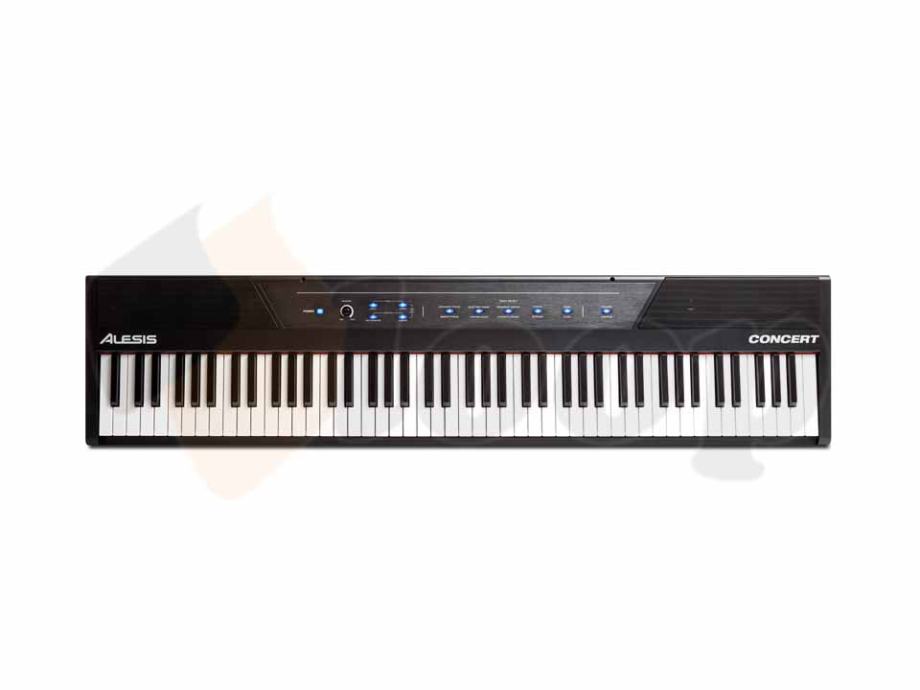 Alesis Concert; digital piano; with 88 standard-size semi-weighted keys with adjustable velocity sensitivity; 10 built-in voices with split and layer function: Acoustic Piano, Bright Piano, Electric Piano, Harp, Drawbar Organ, Church Organ, Synth, Strings, Bass and Clavi; max. Polyphony: 128 notes; speakers: 2x 10W woofer and 2x 20W tweeter; adjustable, integrated metronome with tap-tempo function (30 – 280BPM); adjustable reverb and chorus effect; pedal resonance function; connections: 1x stereo line-out L/R (RCA), 1x headphone output with mute function (6.3mm, jack), 1x sustain pedal input and 1x power supply connector; USB MIDI output for use with practice software or virtual instruments; power supply: 6x D-cell batteries (not included) or external power supply (12V DC / 2A); sustain pedal and power supply included; dimensions (L x W x H): 1283 x 291 x 87mm; weight: 7.1kg