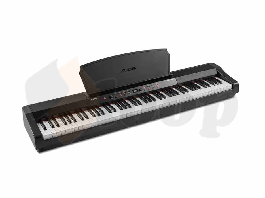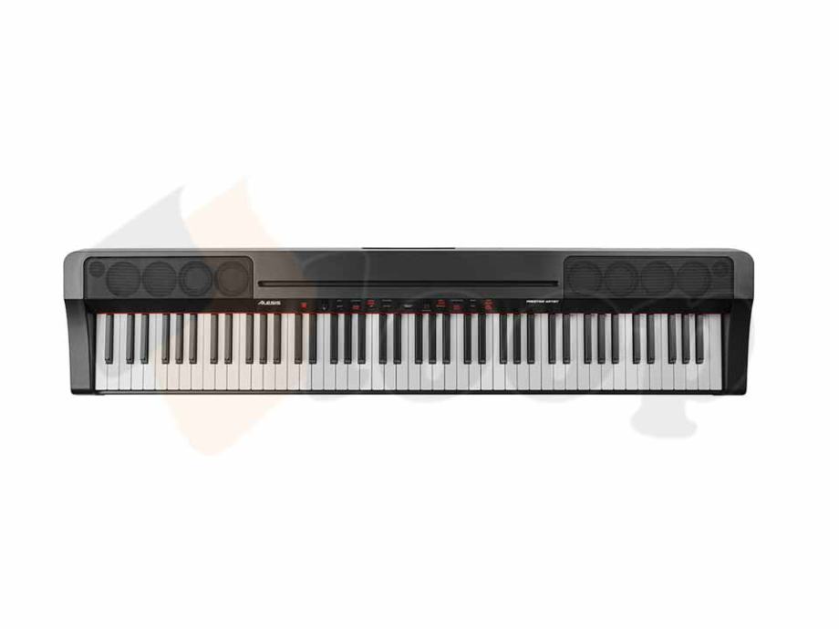 Alesis Prestige Artist; digital piano; 88 full-size keys with graded hammer action and adjustable velocity; 30 built-in voices with split and layer function; max. polyphony: 256 notes; 50W (2 x 25W) micro-array speaker system; with OLED display for quick access to parameters; 5 adjustable reverb effects; built-in arpeggiator; with learn- and record mode; 10 piano demo songs; built-in metronome, adjustable from 30 – 280BPM; connections: 2x line output (6.3mm jack), 2x headphone output with speaker mute function (6.3mm and 3.5mm jack), 1x sustain pedal input (6.3mm jack), 1x 3-pedal connector (5-pin DIN), 1x USB type-B port, 1x power supply connector; USB-MIDI output for use with software or virtual instruments; powered by included power supply (12V DC / 3A); including music stand, software download card, sustain pedal, power supply and user manual; Dimensions (W x D x H): 132.2 x 29.7 x 14.9cm; Weight: 12.8kg
