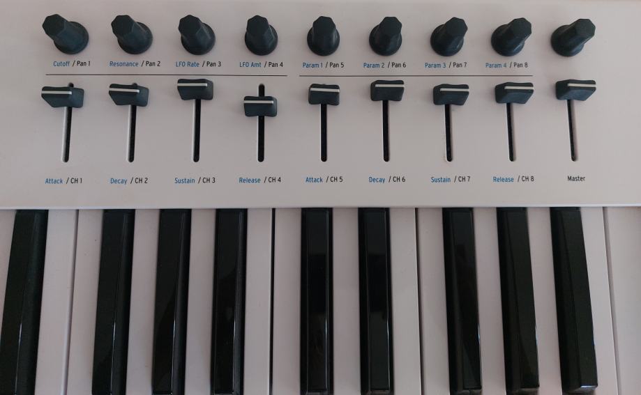 Kontrole za transport, pitch bend, mod wheel, i 9 fadera za jednostavno upravljanje parametrima.