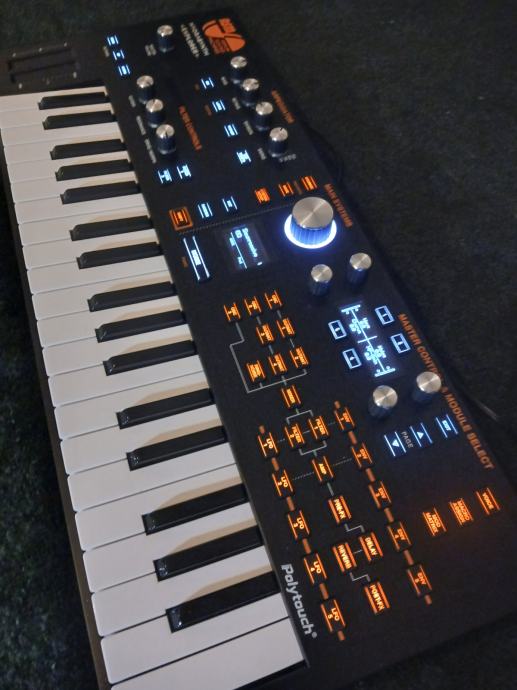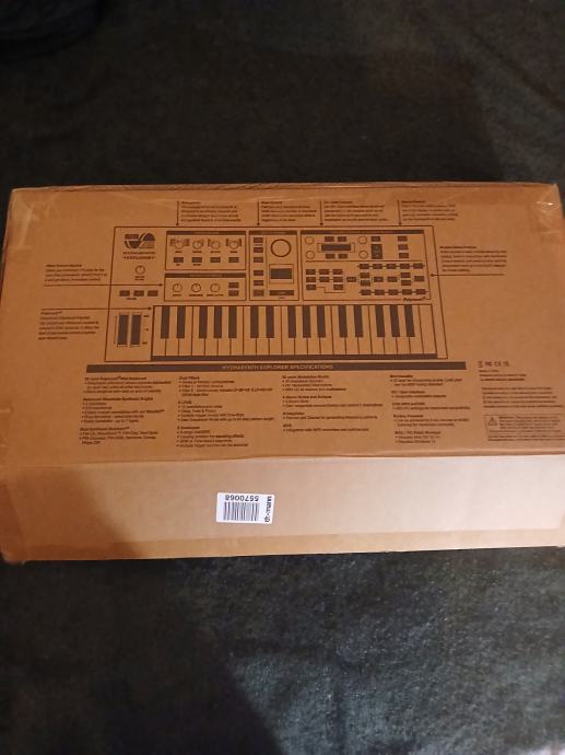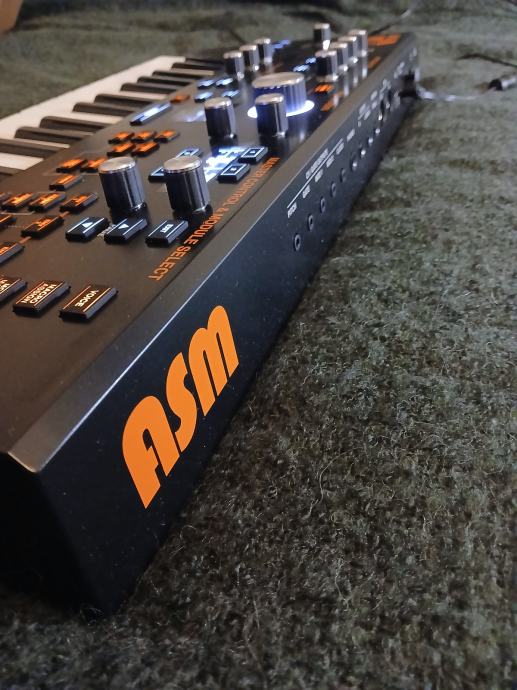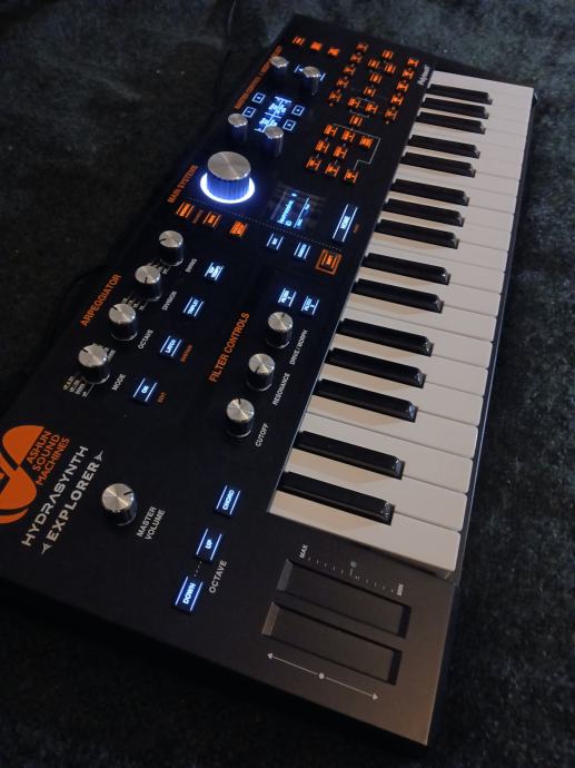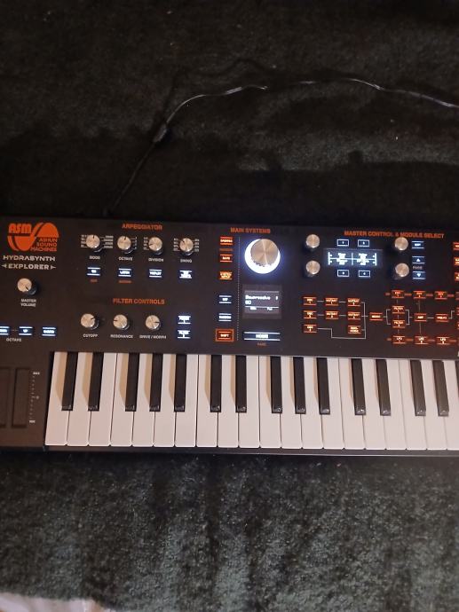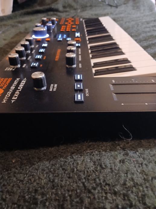 ASM Hydrasynth Explorer: ASM Hydrasynth Explorer donosi legendarni Hydrasynth u nova područja. Hydrasynth Explorer nudi isti 8-glasovni zvučni mehanizam kao Hydrasynth Keyboard i Desktop, ali u kompaktnom i prijenosnom obliku koji se napaja baterijama. Tipke od 37 srednje velikih PolyTouch® tipki s polifonijskim aftertouch efektom nude izvrsnu svirljivost i izražajnost u smanjenom formatu. Izuzetno dubok, ali jednostavan za korištenje zvučni mehanizam sadrži poznate WaveScan oscilatore, Mutator oblikovanje valova, fleksibilnu dvostruku sekciju filtera, 32-slotnu modulacijsku matricu te dvostruke Insert i dvostruke Master efekte, omogućujući doživotna zvučna istraživanja. CV/GATE izlazi omogućuju jednostavnu integraciju s opremom poput modularnih synthesizera, a USB MIDI i MIDI DIN priključci pune veličine osiguravaju standardno povezivanje bez potrebe za posebnim kabelima. ASM Hydrasynth Explorer se također može napajati s 8xAA baterija za istinsku mobilnu upotrebu u pokretu. Jednostavno rečeno, ovo je vrlo moćan kompaktni synthesizer i kontroler u jednom za modernog glazbenika. Ključne značajke: 8-glasovni polifonijski digitalni synthesizer za oblikovanje valova POLYTOUCH™ polifonijski aftertouch efekt, tipke osjetljive na brzinu pritiska s 37 srednje velikih tipki Rad na baterije pomoću 8xAA baterija (nisu uključene) Kompatibilno s MPE (MIDI Polyphonic Expression) Podrška za mikroštimanje putem MIDI Tuning Standard datoteka 3 oscilatora po glasu s ukupno 4 mutatora 1 multimode filter i 1 varijabilni LP-BP/Notch-HP filter po glasu 640 programskih lokacija s pretraživanjem po kategorijama CV/Gate povezivost Specifikacije: Vrsta: Polifonijski synthesizer za oblikovanje valova Vrsta zvučnog mehanizma: Wavescan Analogno/Digitalno: Digitalno Broj tipki: 37 srednje velikih tipki Vrsta tipki: ASM POLYTOUCH™ tipke s polifonijskim aftertouch efektom, osjetljive na brzinu pritiska Ostali kontroleri: Pitch Bend, Mod Wheel Polifonija: 8 glasova Broj predložaka: 640 Oscilatori: 3 x Wavescan oscilatora (219 valnih oblika), 4 x Mutator oblikovača valova (8 vrsta), Šum (7 vrsta) Mutatori: 8 vrsta (FM-Lin, WaveStack, PW-Orig, PW-Squeeze, PW-ASM, Harmonic Sweep, Hard Sync, PhazDiff) Šum: 7 vrsta (bijeli, ružičasti, smeđi, crveni, plavi, ljubičasti, sivi) LFO: 5 po glasu (Sine, Triangle, Saw Up, Saw Down, Square, Pulse27%, Pulse13%, S&H, Šum, Nasumično, Korak), sinkronizacija tempa, zaključavanje polutona Envelope generatori: 5 po glasu, sinkronizacija tempa, varijabilni izvori okidanja Vrste filtera: 1 multimode filter (16 vrsta) i 1 varijabilni LP-BP/Notch-HP filter, serijsko ili paralelno usmjeravanje Filteri: Filter 1 (LP Ldr12, LP Ldr24, LP Fat12, LP Fat24, LP Gate, LP MS20, HP MS20, LP 3-Ler, BP 3-Ler, HP 3-Ler, LP Stn12, BP Stn12, HP Stn12, LP 1 Pole, LP 8 Pole, Vowel), Filter 2 (LP-BP-HP, LP-Notch-HP) Efekti: 9 Insert efekata, 5 delay efekata, 4 reverb efekta. Vrste efekata: Chorus, Flanger, Rotary, Phaser, Lo-Fi, Tremolo, EQ, Kompresor, Distortion, Delay, Reverb Arpeggiator: 8 vrsta (gore, dolje, gore&dolje, gore/dolje, redoslijed, nasumično, akord, fraza) Ostalo: Modulacijska matrica (32 utora), Makro kontroleri (8), Favoriti (32), Randomizer (Patch i Modul), MPE kompatibilnost, Warm Mode, Mikroštimanje Audio izlazi: 2 x 1/4" balansirani (L/Mono, R) Slušalice: 1 x 1/4" USB: 1 x Type B MIDI U/I: Ulaz/Izlaz Ulazi za pedale: 1 x 1/4" (sustain) Ostali izlazi: 5 x 1/8" izlazi (kontrolni napon, Gate, Mod1, Mod2, Clock) Napajanje: 12V DC preklopno napajanje Visina: 5.8 cm Širina: 55.4 cm Dubina: 24.7 cm Težina: 3.46 kg
