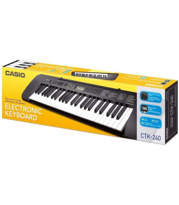 Casio CTK240 sintasajzer. Casio CTK 240 klavijatura namijenjana je za sve one koji žele svladati osnove sviranja. Casio CTK240 model klavijature ima 49x tipki (4 oktave), 100x ritmova, 100x zvukova, 50x demo skladbi.