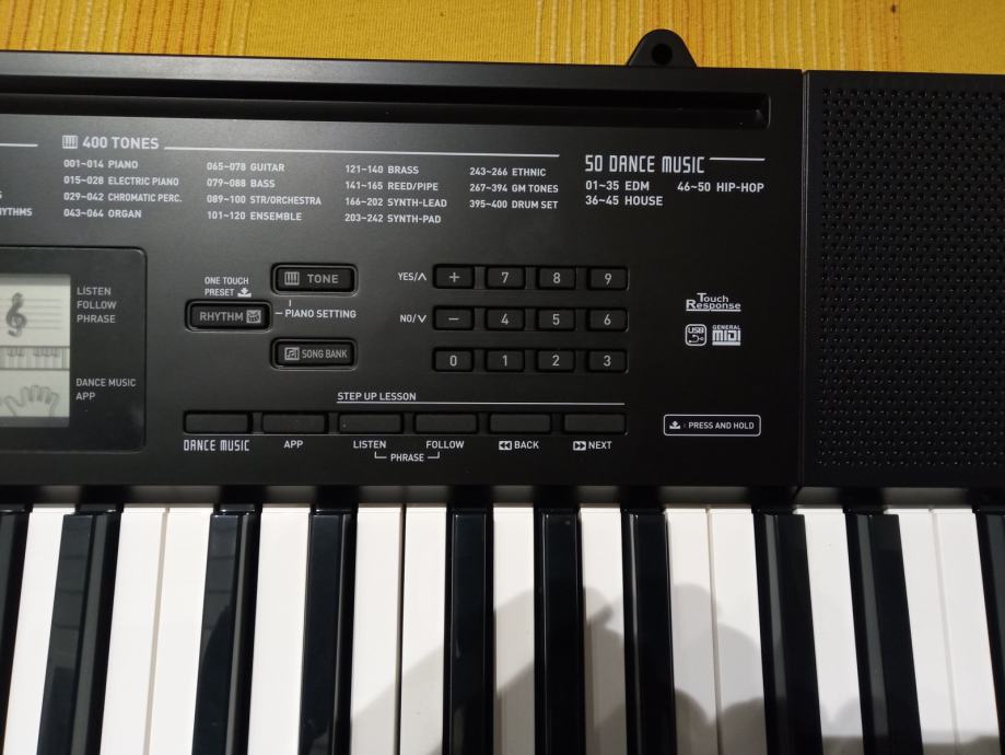 Klavijatura pogodna za početnike, a i naprednije svirače, 61 dinamička tipka, 48 voice polifonija, 400 zvukova, efekti, 60 preset pjesama, 100 preset ritmova, funkicja za učenje lijeve, desne i obje ruke, ptch bend kotačić, transposer, metronom, USB MIDI izlaz, audio input 3,5 mm stereo jack, izlaz za slušalice / razglas, sustain pedala, zvučnici, mogućnost rada na baterije, dimenzije 946 x 307 x 92 mm, težina 3,4kg, pripadajući strujni adapter