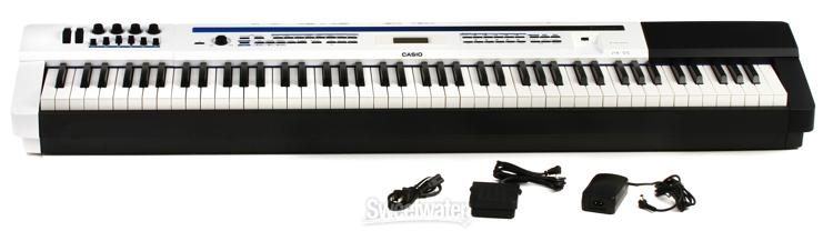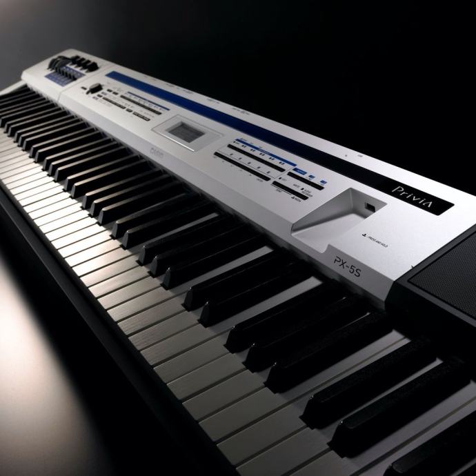 Casio PX-5S stage piano-synthesizer kao nov, u odlicnom tehnickom i estetskom stanju. Dolazi sa futrolom na mjeru i original kartonom koji ukljucuje strujni adapter, 2 komada sustain pedale SP-3 . Instaliran zadnji firmware v. 1.13. Uz klavijaturu na poklon usb stick sa puno extra soundova-stage settinga. Klavijatura ima 88 klavirskih tipki i moze splitati i layer do 4 sounda i moze raditi kao odlican master keyboard na kome se moze zasebno koristiti Midi I/O i USB midi.