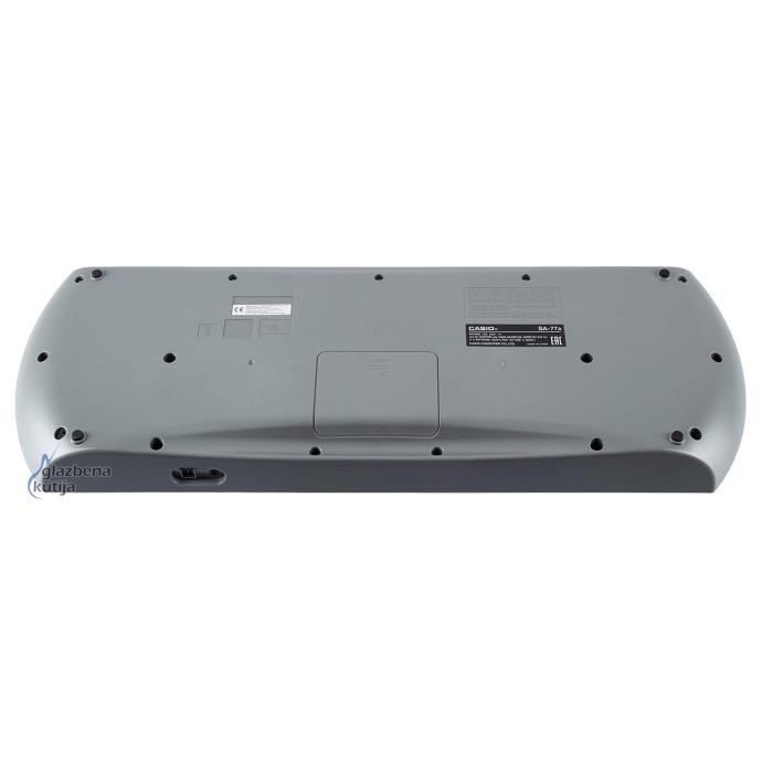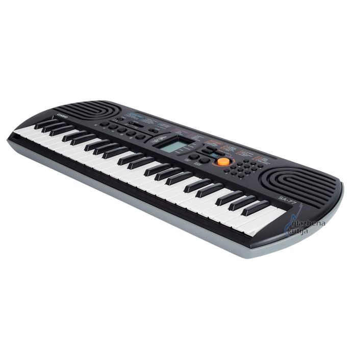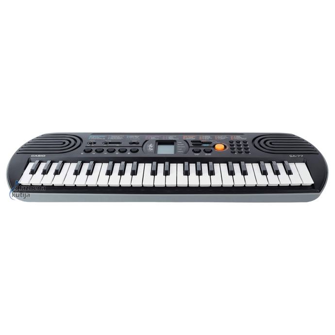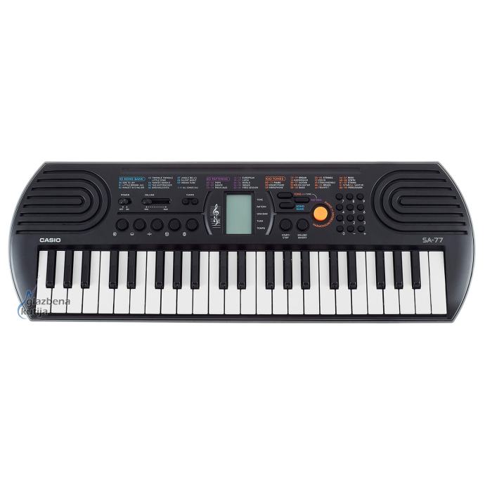 Casio SA-77 je idealan prvi glazbeni instrument. Zahvaljujući šarenoj podlozi, vizualno će se svidjeti djeci, ali istovremeno, zahvaljujući edukativnom programu, moguće je i stvarno razviti glazbenu osjetljivost, motoriku i sviranje klavijature. Uz klavijaturu ne dolaze baterije i adapter.