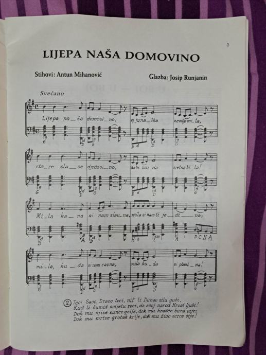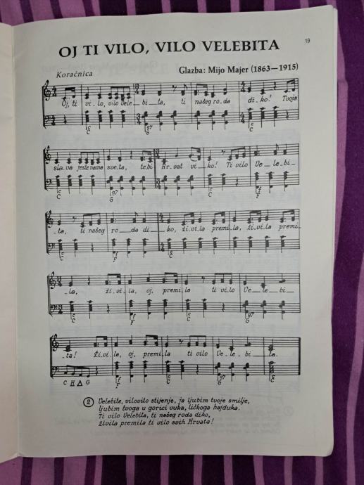 Lijepa naša domovino - Pjesma ličkog junaka - Oj ti vilo Velebita - Tko je srce u te dirno - Vrbniče nad morem - Vozila se po moru galija - Ti si rajski cvijet - Za jedan časak radosti - Gledam bajnu zoru - Ustani bane - U boj, u boj - Trudan putnik - Pijmo, braćo, vince - Gori nebo visoko - Kad smo se pelali - Stara me majka kara - Tri male seke - Veselo srce kudelju prede - Poleg te navade stare - Nikaj nije lepšega - Labud se kupa