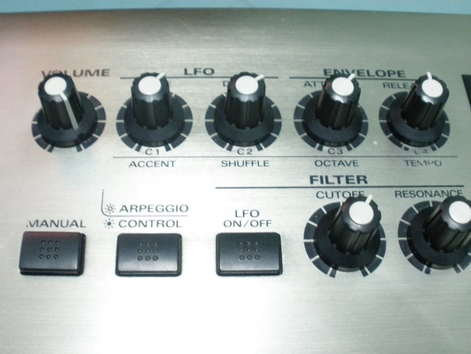 6 knobs (4 assignable) for realtime control over cutoff, envelopes, etc.