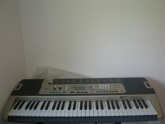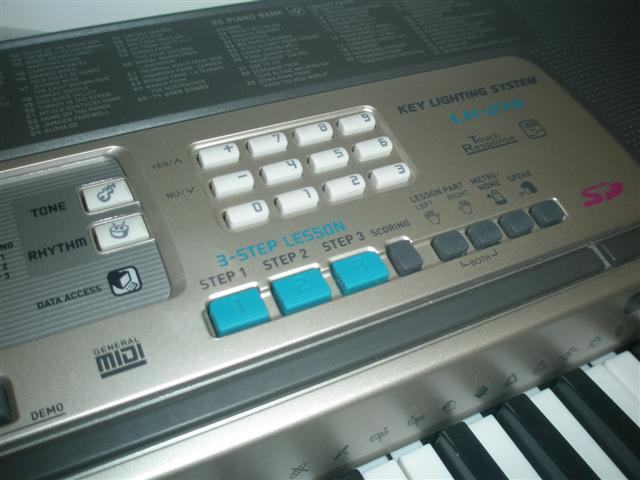 Synthesizer CASIO LK 215, 61 dinamička tipka (pet oktava), 120 ritmova, 264 raznih tonova instrumenata, bubnjeva, pratećih vokala i dr., 100 memoriranih demo skladbi za učenje sviranja, 3 stupnja težine učenja uz svjetlosnu i glasovnu navigaciju (kad uključite demo, svijetle tipke po redu kako trebate svirati skladbu, glas vam govori kojim prstima pravilno morate pritisnuti, a na LCD displeju vam ispisuje note i akorde koje svirate i pokazuje raspored prstiju obje ruke ), metronom, mikrofonski ulaz, utor za SD memorijsku karticu kojom sa kompjutora možete kopirati u sintić još mnoštvo demo pjesama za učenje, USB port i instalacijski CD driver za direktan spoj Casia na kompj., ulaz za piano pedalu, ulaz za strujni adapter, izlaz za slušalice ili prema pojačalu ( možete se spojiti na cd-ulaz gitarskog pojačala, na jače zvučnike za kompjutor ili kućno kino), sintić ima 2.5 + 2.5 W zvučnike, mogućnost sviranja na baterije (6xAA 1.5V), Casio Song Book sa notama i pjesmama za učenje, uputstvo na hrvatskom, dimenzije 945x 373x 135, 4.7 kg, original kutija, cijena u dućanu je 1700 kn.