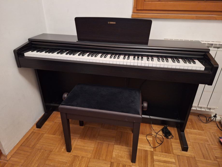 Izvrsno očuvan, vrlo malo sviran kvalitetan digitalni klavir / pianino uz pripadajući stolac. Instrument je kupljen u prosincu 2023. u zagrebačkoj trgovini Melodija. Na prodaju zbog nekorištenja.