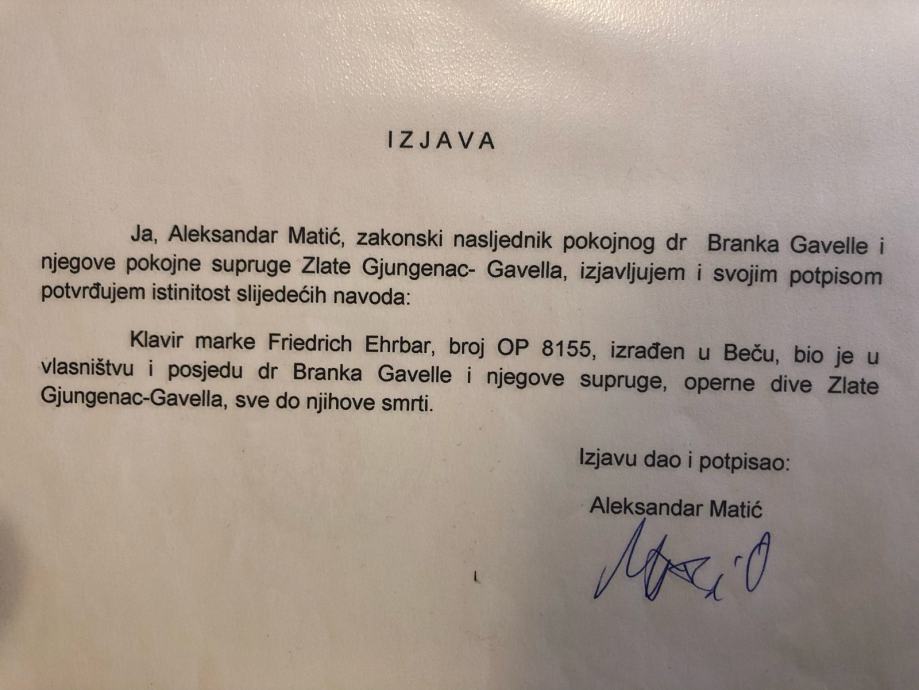 Klavir je izrađen u Beču krajem 19. stoljeća, a bio je u vlasništvu i posjedu dr. Branka Gavelle i njegove supruge i operne dive Zlate Gjunganec-Gavella sve do njihove smrti.