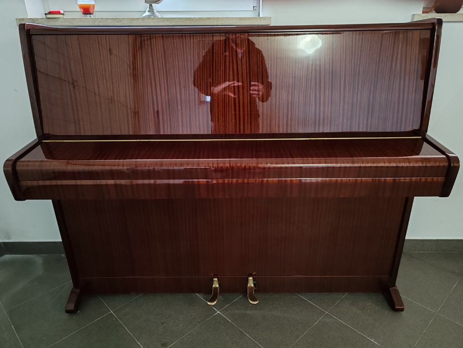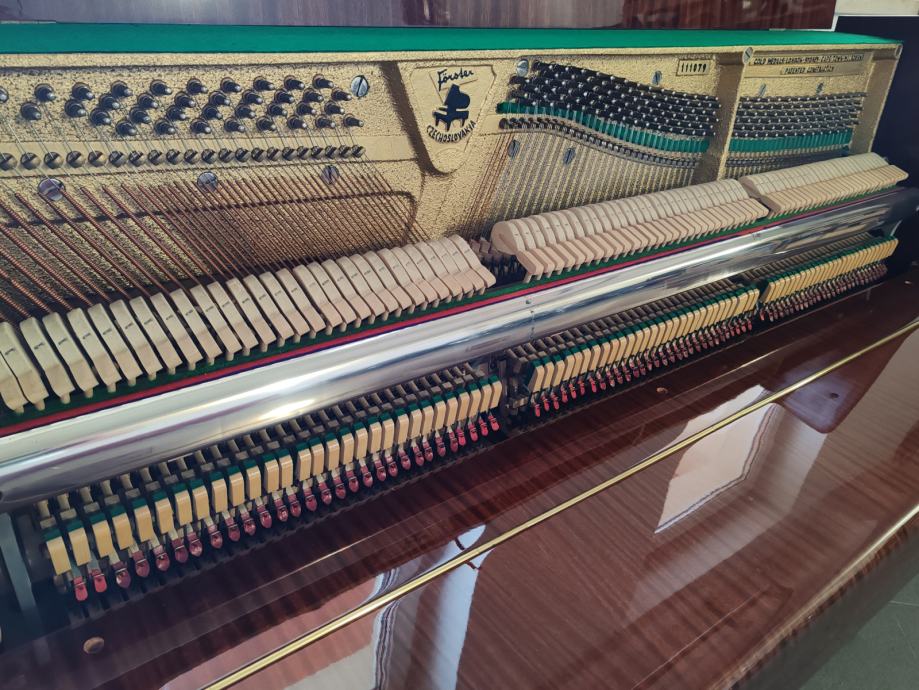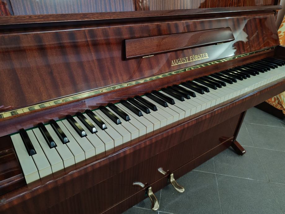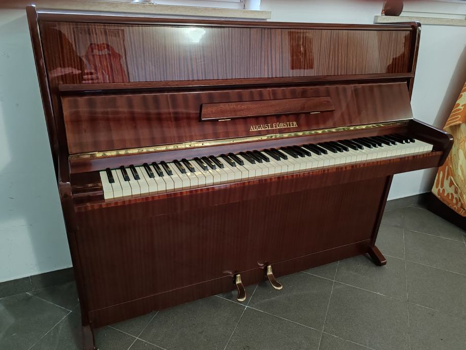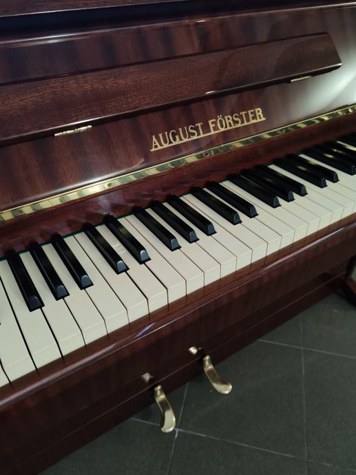 Prodaje se nevjerovatno očuvani i visoko kvalitetni pianino August Forster. Prva je ruka i nije istrošen. Uvijek stajao u suhom, daleko od radijatora, vlage i sunca. Smeđe je boje, ima visoki, tvornički sjaj i nije izblijedio od sunca kako to obično bude uobičajeno. Idealan je za nastavu klavira tj. za vježbanje kroz sve stupnjeve školovanja a pogotovo za učenike i studente koji se s glazbom žele ozbiljnije baviti. Rijetko ćete naći ovako očuvan pianino a za ovaj to vrijedi koliko za mehaničke unutarnje dijelove, toliko i za njegovu vanjštinu. Jako malo je zapravo sviran. Odlično drži štim, batići imaju dovoljno "mesa" a svi filcevi i remenčići su nepotrošeni što zna biti rijetkost i boljka za rabljene klavire. Pianino je ugođen nedavno dva puta prije prodaje i pregledan te nema nikakvih daljnjih ulaganja. Mehanika je također kompletno izregulirana.