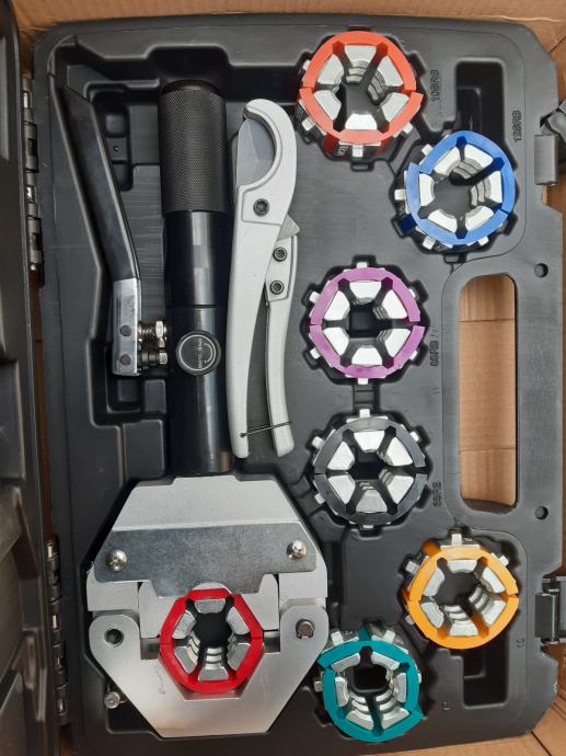 Komplet alata u koferu za izradu proširenja na gumenim cijevima klime automobila. + gratis rezač cijevi. Jednostavno izradite dvostruke ili obične spojne završetke cijevi.