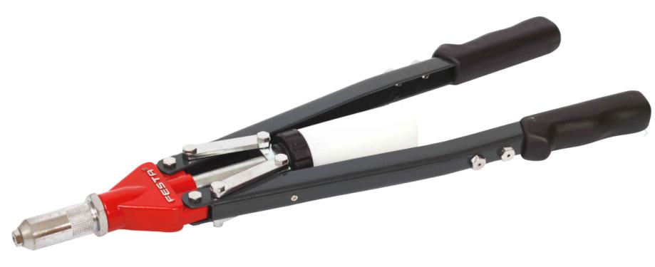 Profesionalna kliješta za zakivanje FESTA - Cr-Mo čeljusti za zakovice promjera 2,4 - 3,2 - 4,0 - 4,8 - 6,4 mm. Materijali za zakovice aluminij, čelik, nehrđajući čelik, bakar. Robusni čelični okvir, plastične ručke, ključ za jednostavnu zamjenu krajeva pojedinačnih promjera, siguran plastični spremnik za skupljanje slomljenih zakovica