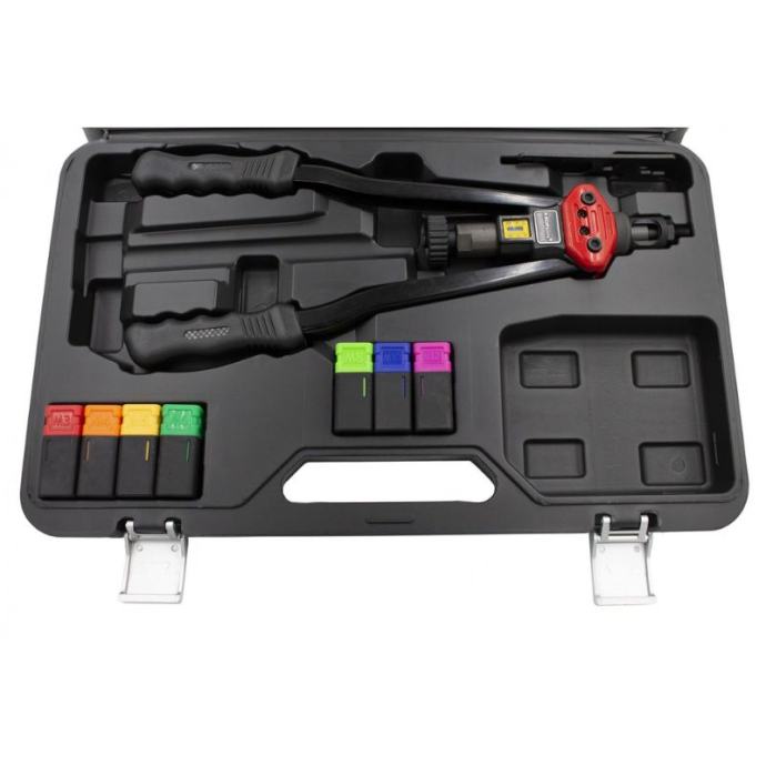 pričvršćivanje pop zakovica je jednostavno zahvaljujući ovim kliještima, koja dolaze u zgodnoj plastičnoj kutiji za pohranukutija sadrži jedan par kliješta, ali ih koristite za dva različita poslapomoću dodataka podešavate alat, tako da imate kliješta za slijepe matice ili kliješta za zakovicetime se štedi prostor u radnom prostoru, a potreban vam je materijal uvijek pri rucikliještima pričvršćujete pop zakovice različitih promjerada biste to učinili, pričvrstite mlaznice na kliješta u ručkislijepe matice se također se lako postavljaju, a svaki od dodataka sigurno je zapakiran u plastičnu kutijukao rezultat, svaki dio ima svoje mjesto, a potrebne alate možete brzo pronaći zahvaljujući kodu u bojipop zakovice u promjerima: 2,4 mm / 3,2 mm / 4 mm / 4,8 mm/ 6 mm / 8 mmslijepe matice u veličinama: M3, M4, M5, M6, M8 i M10, M12]]>