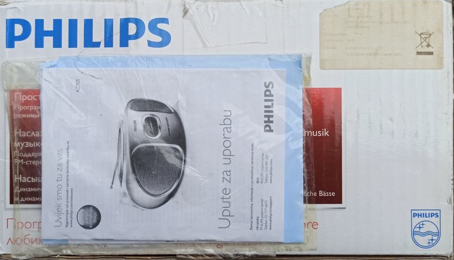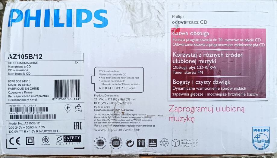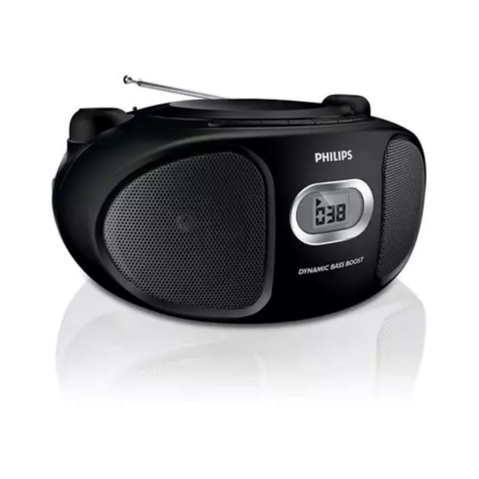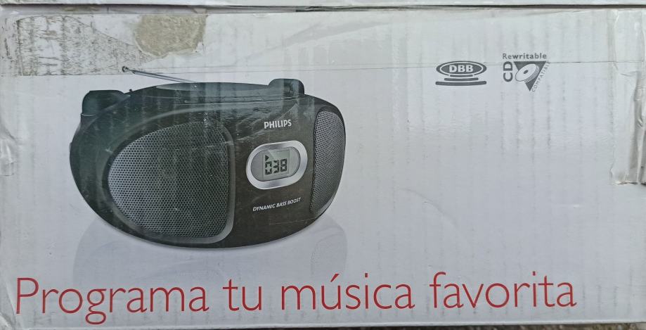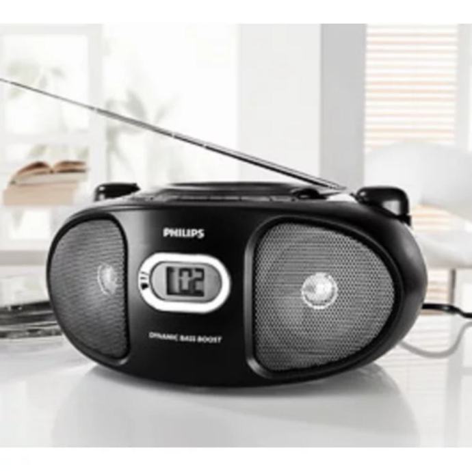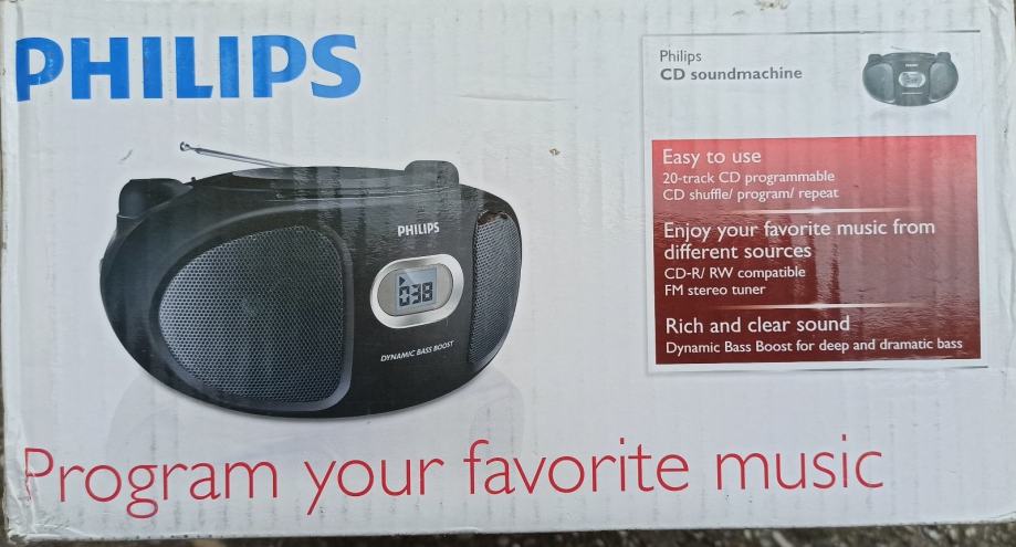CD Soundmachine, Reprodukcija CD-a, CD-R i CD-RW, FM stereo tuner, Audio ulaz za jednostavnu reprodukciju prijenosne glazbe, Mediji za reprodukciju zvuka: CD, CD-R, CD-RW, Frekvencijski pojasevi tunera: FM, FM antena, Automatsko digitalno podešavanje, Zvučni sustav: stereo, Kontrola glasnoće: gore/dolje, Poboljšanje zvuka: Dinamičko pojačanje basa, Maksimalna izlazna snaga (RMS): 3 W, Broj ugrađenih zvučnika: 2, Završna obrada rešetke zvučnika: metalna, Povezivost: Audio ulaz (3,5 mm), Vrsta napajanja: AC ili baterijski ulaz, Vrsta baterije: Veličina C (LR14), Napon baterije: 1,5 V, Broj baterija: 6, Pribor: Kabel za napajanje, Dimenzije proizvoda (ŠxDxV): 252 x 232 x 124 mm, Težina proizvoda: 1 kg