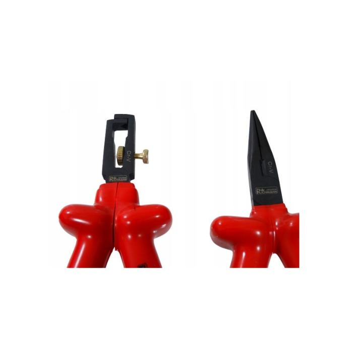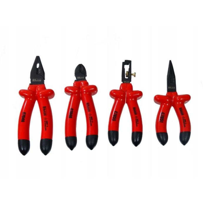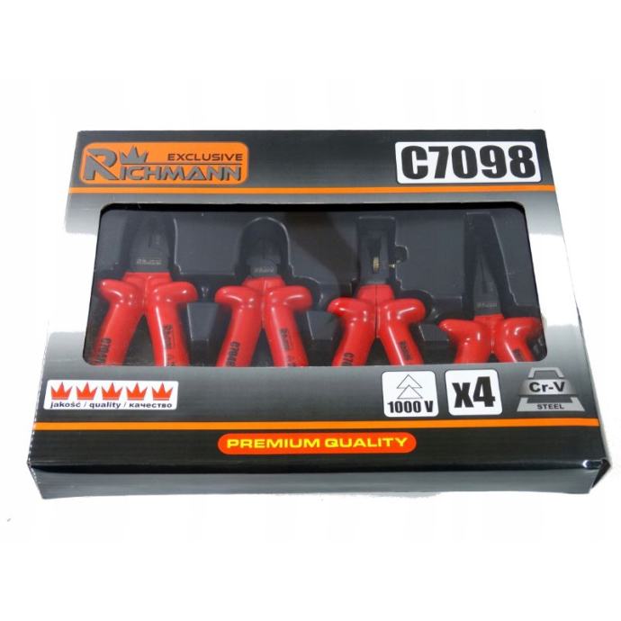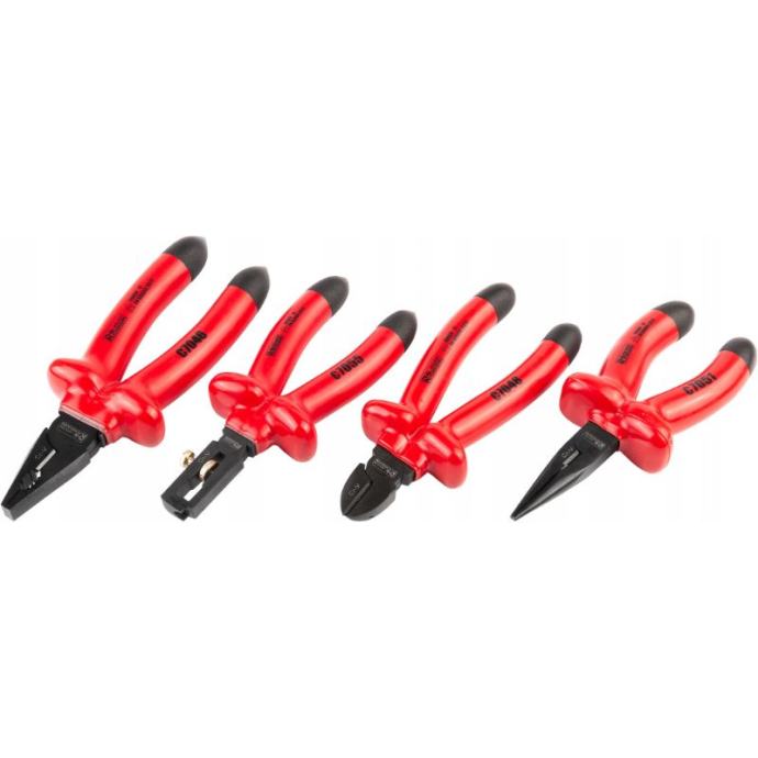 set od 4 izolirana kliješta i skidač žiceradni dio je izrađen od krom-vanadij čelika (CR-V), korišteni krom jamči otpornost čelika na koroziju, oksidaciju, abraziju i visoku čvrstoću na visokim temperaturama, a dodatak vanadija također utječe na otpornost na visoke temperature i nedeformacije , pocrnjelozbirno pakiranje omogućuje uredno skladištenje i odlaganje kompleta u radionička kolicaergonomske, masivne, protuklizne ručke izrađene od izdržljivog izolacijskog materijalaprekriven antikorozivnim premazom1.kliješta izolirana kombinirana 180 mm C7046:ukupna duljina: 180 mmdužina čeljusti: 60 mmizolacija: 1000V2. Izolirani dijagonalni rezači 160 mm C7048:ukupna duljina: 160 mmduljina čeljusti: 50 mmizolacija: 1000V3. Skidač 160 mm C7055ukupna duljina: 160 mmduljina čeljusti: 50 mmizolacija: 1000V4. Ravna dugačka izolirana kliješta 160 mm C7051:ukupna duljina: 160 mmdužina čeljusti: 60 mmizolacija: 1000V]]>