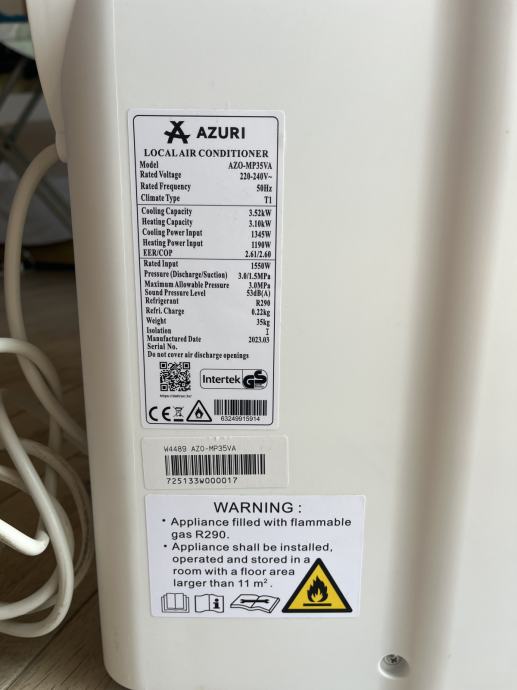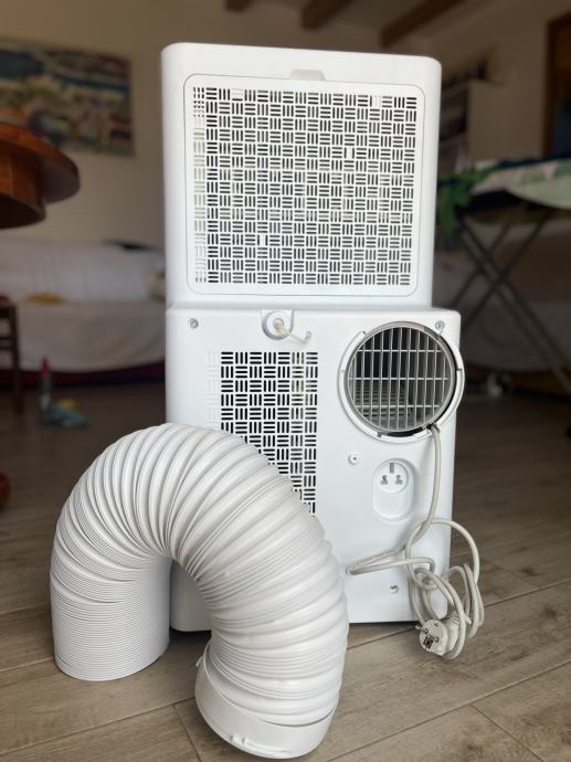 Azuri klima ima snagu hlađenja 3.5kW čime pruža hlađenje za prostorije do 40m2. Idealna je za domove, spavaće sobe,urede ili manje komercijalne prostore. Nudi 3 glavne funkcije : hlađenje, ventilacija i dehumidifikacija. Jako je jednostavna i praktična. Ima kotačiće te se lako prenosi, a njezine dimenzije (42x78) i izgled omogućuju joj da se uklopi u moderni prostor. Sa klimom možete upravljati putem daljinskog upravljača, na samom uređaju ili putem mobilne aplikacije. Klima radi uz minimalnu buku te je pogodna za bilo kakav prostor. Dolazi uz cijev koja odvodi vrući zrak.Koristena 1 mj.