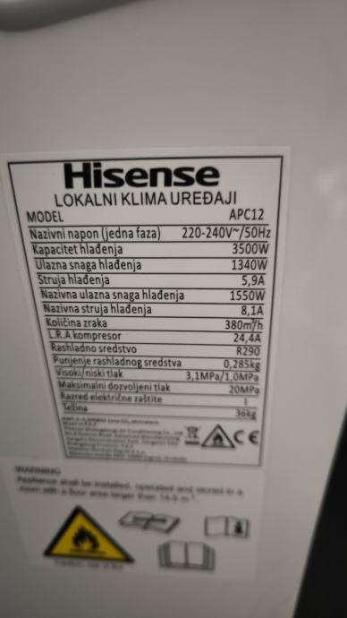 Prodaje se navedeni Hisense prijenosni/mobilni klima uređaj 3,5kw, korišten jednu sezonu, u izvrsnom stanju, prodaja zbog nabavke stacionarne klime!