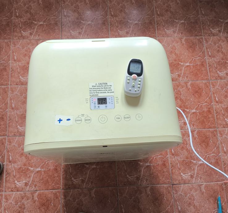 Klima prijenosna, Midea. Ispuh obložen termotrakom, snižava temperaturu u prostoriji jer temperatura cijevi pada sa 60°C na 30. Prerađena da usis nije iz prostorije nego je izvana Efektivnost dovedena do maksimuma. Lani napravljen veliki servis - rastavljena i očišćeni hladnjaci i turbine. Uz klimu ide i cerada za prozor koja se jednostavno postavlja, dam upute kupcu. Najjednostavnija postava za najmanji ulog.