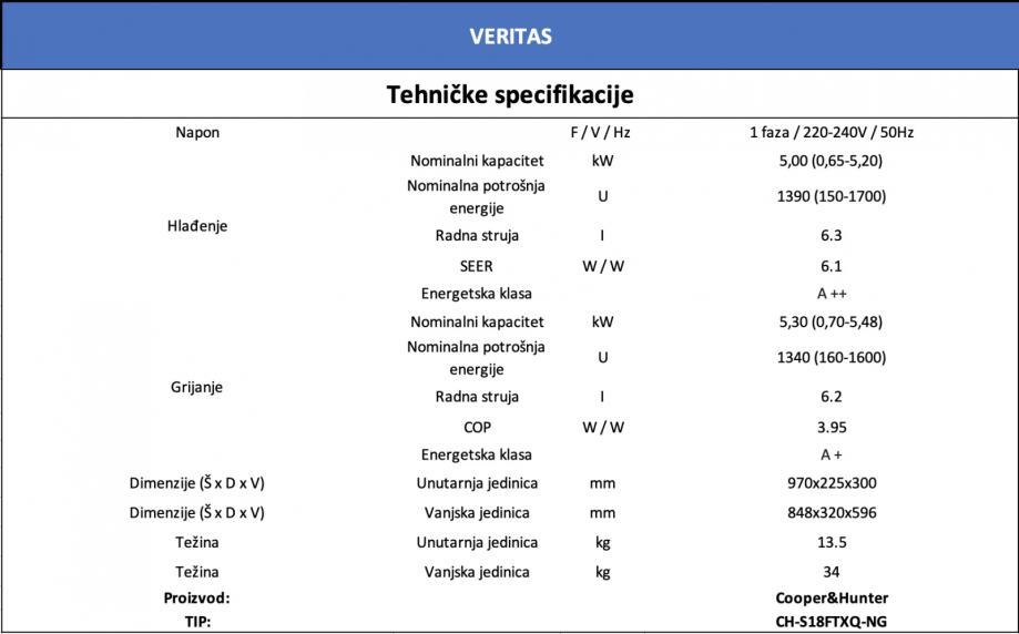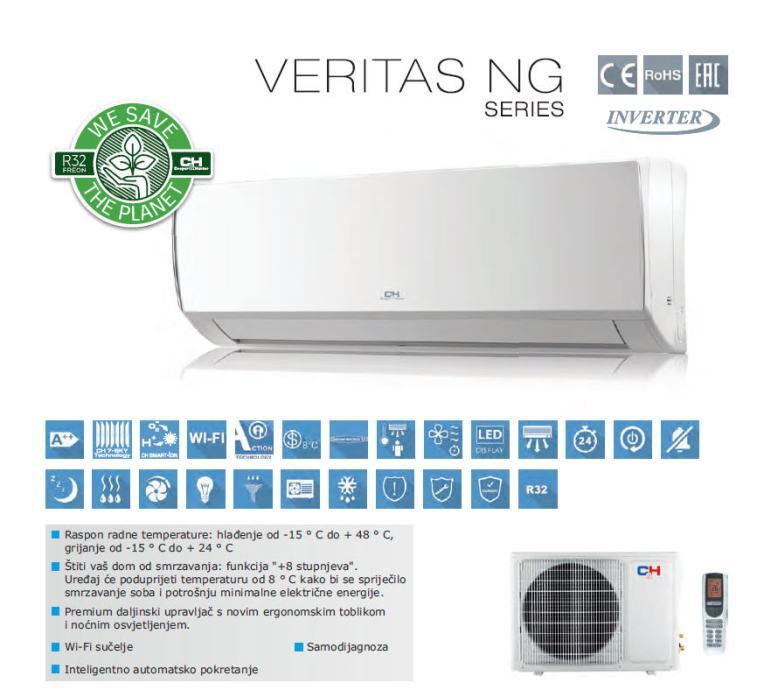 Cooper & Hunter klima uređaj Veritas CH-S18FTXQ2-NG (WI-FI) serije je provjereni inverter klima uređaj koji je najtraženiji zbog povećane kvalitete izrade i vrhunskog materijala. Klima uređaj je dizajniran prema novim europskim tehnologijama i nudi vrhunsku energetsku učinkovitost u načinu hlađenja i grijanja. Jedinica ima klasu energetske učinkovitosti A++ prema posljednjoj EU direktivi ErP (Energy related Products). Model ima temperaturni raspon rada na vanjskoj temperaturi od -15°C do +24°C za toplinu i od -15°C do +48°C za hladno.