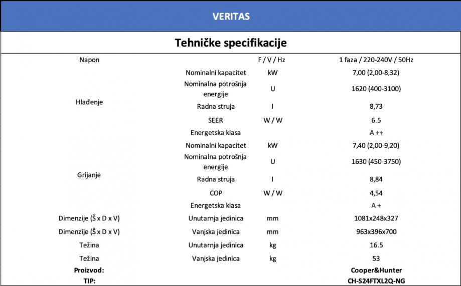 Cooper & Hunter klima uređaj Veritas CH-S24FTXQ2-NG (WI-FI) serije je provjereni inverter klima uređaj koji je najtraženiji zbog povećane kvalitete izrade i vrhunskog materijala. Klima uređaj je dizajniran prema novim europskim tehnologijama i nudi vrhunsku energetsku učinkovitost u načinu hlađenja i grijanja. Jedinica ima klasu energetske učinkovitosti A++ prema posljednjoj EU direktivi ErP (Energy related Products). Model ima temperaturni raspon rada na vanjskoj temperaturi od -15°C do +24°C za toplinu i od -15°C do +48°C za hladno.