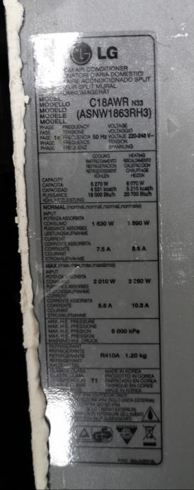 Prodajem klima uređaj LG C18AWR (Art inverter - zrcalo) s vanjskom jedinicom, 2008. godina, Hlađenje radi izvrsno, opcija GRIJANJA NE RADI.