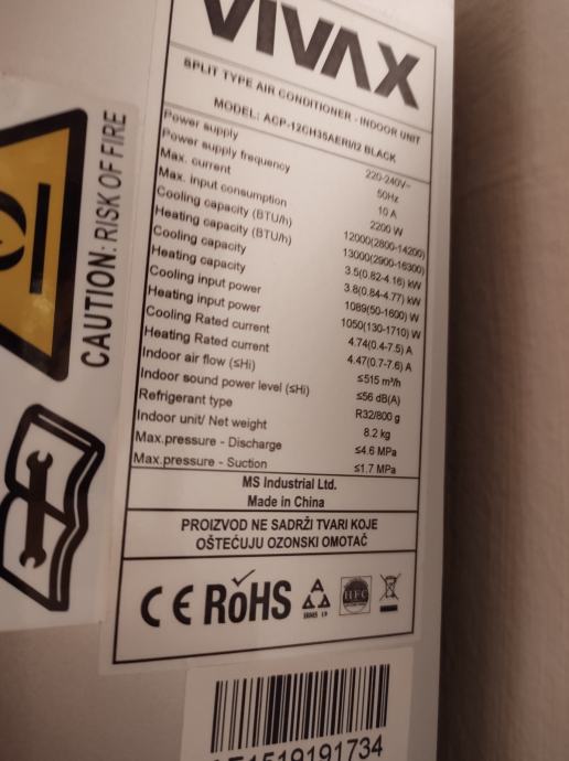 Klima uređaj Vivax, star 2 godine, malo korišten, montiran u stanu, hlađenje i grijanje, potrebno ga je deinstalirati