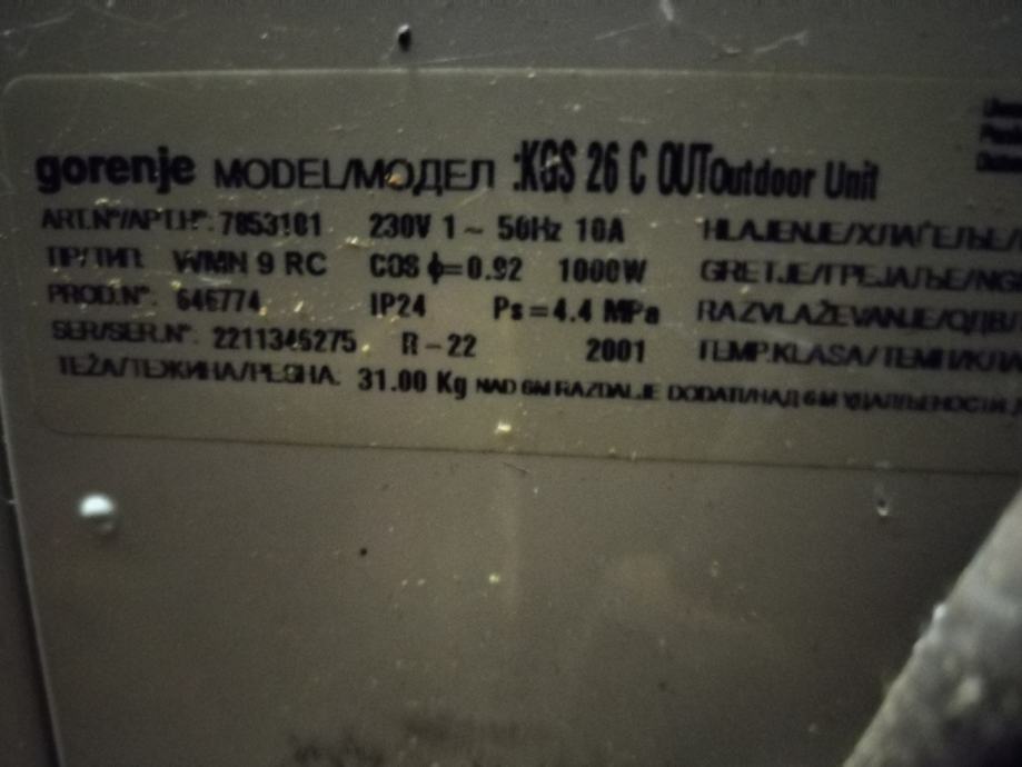 Ispravan i demontiran klima uređaj marke GORENJE - model: model KGS 26 C.
