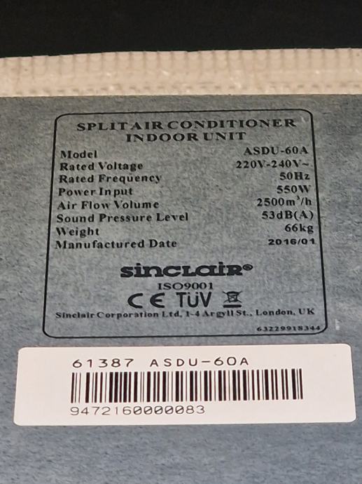 Povezava do tehničnih podatkov notranje enote: https://www.sinclair-solutions.com/sl/arhiv/uni-on-off-kanalske-enote-arhiv/4232-asdu-60a.html