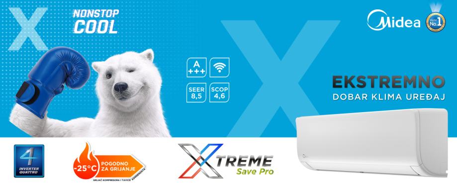 Novi Midea Xtreme Save klima uređaj može uštedjeti do 60% potrošnje energije jednim dodirom. Njegova vrlo učinkovita izvedba u kombinaciji s dva filtera za pročišćavanje zraka, UV lampom i dodatnim grijačima u vanjskoj jedinici, čini ga savršenim izborom za sigurno i povoljno grijanje ove zime. XTREME SAVE inverter toliko moćan kao što je i tih, opremljen je vodećom Midea tehnologijom izvrsnih performansi s pažnjom na potrošnju. Nova generacija Midea Blanc klime odlazi uz novu četvrtu generaciju Energy procesora, smart Save Precision kontrolni algoritam i inverter Quattro kompresor koji primjenjuje tehnologiju pokretanja visoke frekvencije kako bi generirao snažan protok hladnog / toplog zraka u vrlo kratkom vremenu, a u svrhu Vaše trenutne udobnosti.