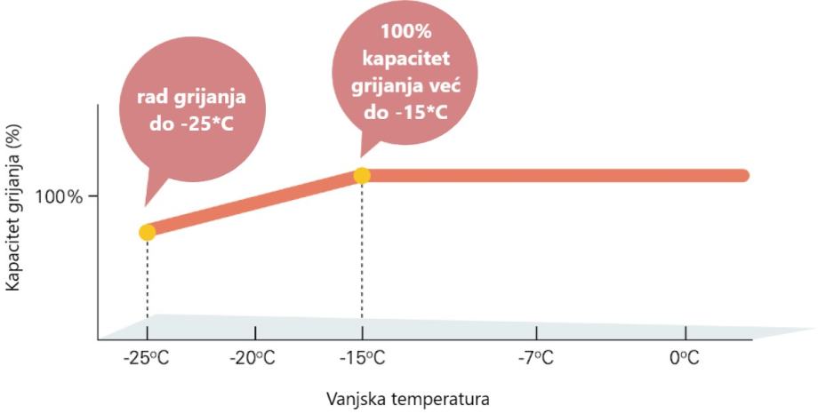 Vanjska jedinica split sustava (reverzibilna dizalica topline) zaštićena od vremenskih utjecaja, s ugrađenim kompresorom s inverterskom regulacijom snage i potrošnje, te svim potrebnim elementima za zaštitu, kontrolu i regulaciju uređaja i funkcionalan rad, koja zadržava nazivni kapacitet do vanjske temperature od -15 °C, te radi u režimu grijanja do vanjske temperature od -25 °C, sljedećih tehničkih značajki: