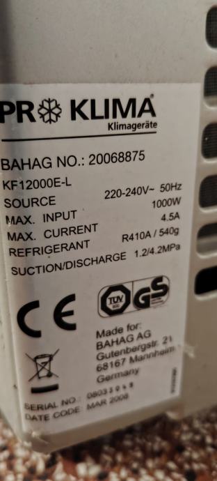 Prodajem mobilnu klimu snage 3,5 kW, marke Pro klima, Bauhaus, ispravna i spremna za rad.