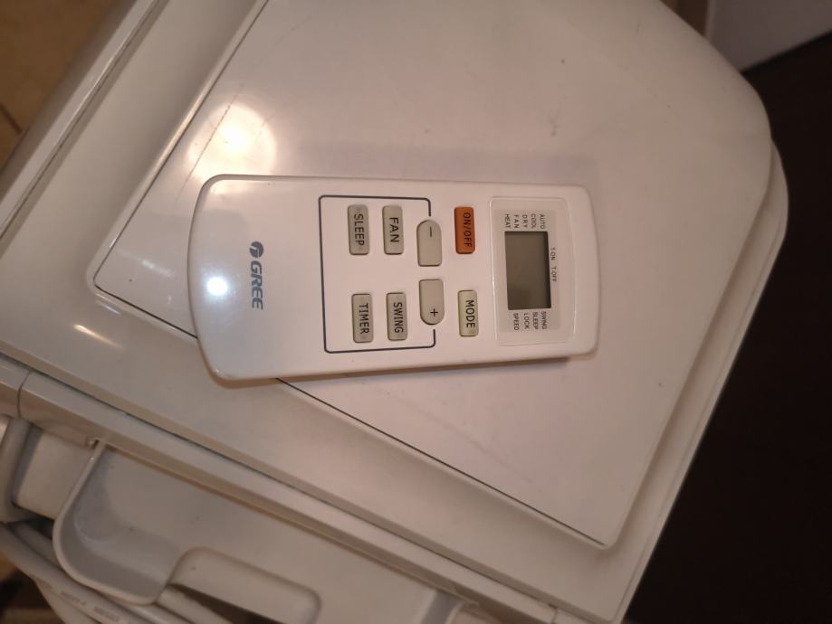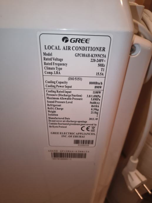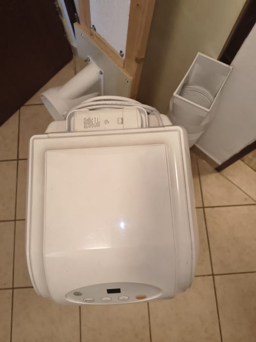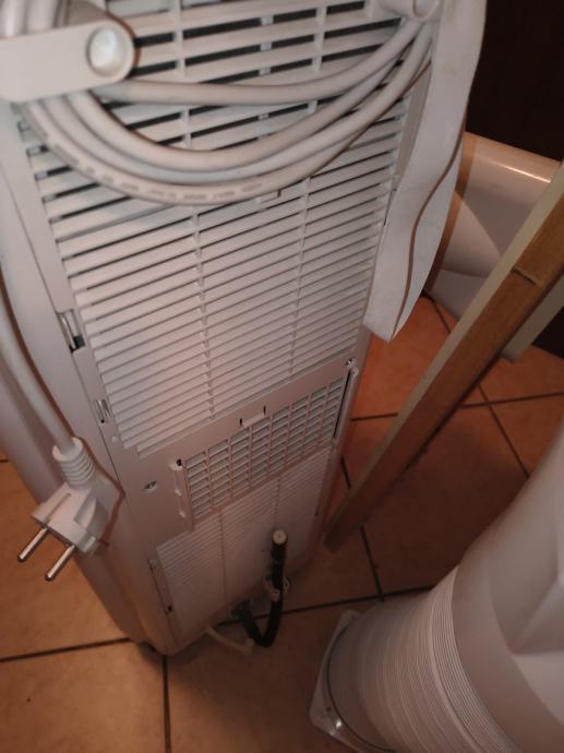 Mobilna klima u odličnom stanju, vrlo malo korištena, s fleksibilnom cijevi za ispuh toplog zraka i daljinskim upravljačem.