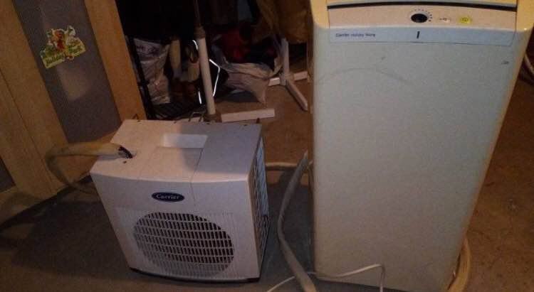 Mobilni klimatizacijski uređaj tvrtke Carrier, s hlađenjem od 3500w. Potpuno funkcionalan. Sustav se sastoji od unutarnje i vanjske jedinice. Plin je napunjen, Crijevo je fleksibilno.Unutarnja jedinica ima posudu za kondenzat. Predviđena je za hlađenje do 40m2. Nema opciju grijanja. Idealno za vikendice itd.