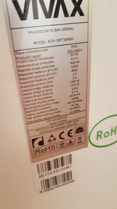 Prijenosna Vivax ACP-12PT35AEH klima sa hlađenjem od 3.5kW i grijanjem 2.9kW. Klima je kao nova, korištena zadnje dvije godine po 2 mjeseca u ljetu. Zbog selidbe ju prodajem. Fleksibilno crijevo je malo modificirano tako da bi kupac eventualno morao nabaviti novo crijevi, ali sve što imam dajem sa klimom.