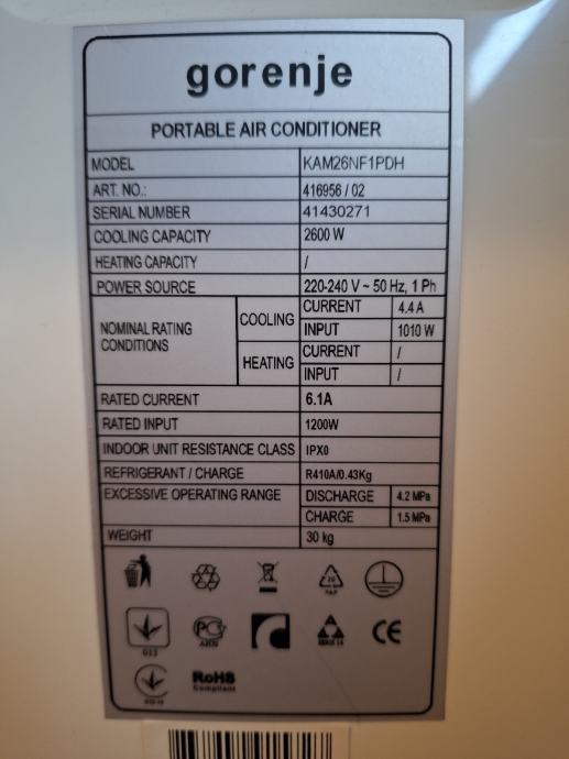 Prodajem rabljenu prijenosnu klimu Gorenje model KAM26NF1PDH. Vrlo malo korištena (jer je ubrzo ugrađena split klima u stanu). Rashladni kapacitet od 2600 W, nominalne snage 1200 W. Rashladni medij je R410A. Težina uređaja je 30 kg. Uz klimu ide i fleksibilna cijev za odvod toplog zraka.