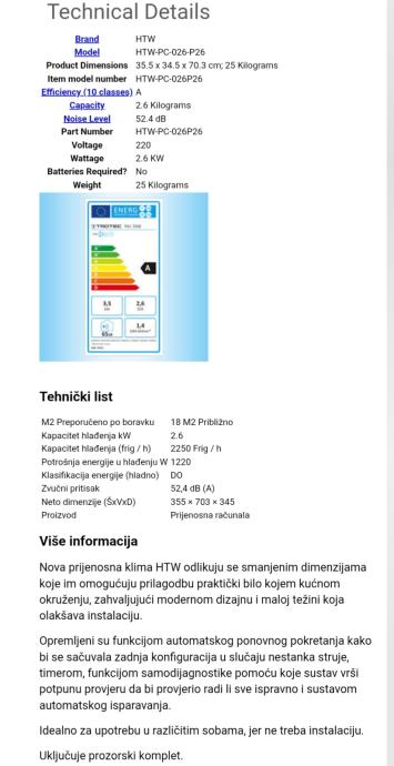 * Funkcije: hlađenje, ventilacija, odvlaživanje