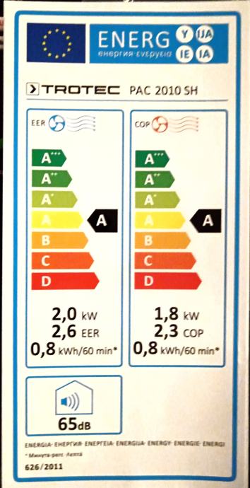 Prijenosna klima TROTEC PAC 2010 SH ; grijanje i hlađenje, korištena svega nekoliko puta, podaci na slici.