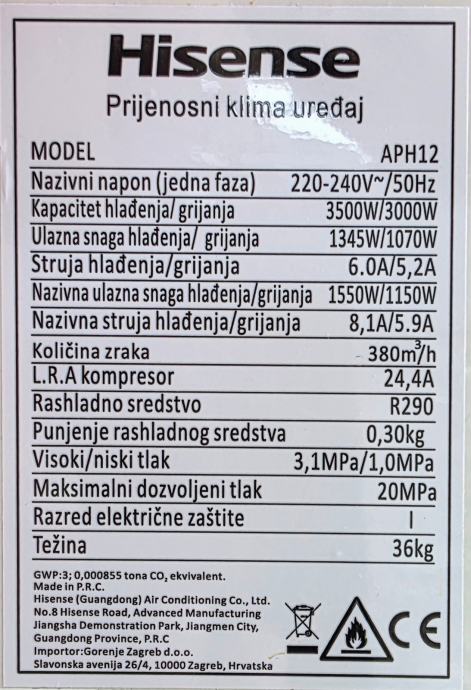Prijenosni klima uređaj, hlađenje i grijanje (3.5/3kW), uključeno original crijevo za ispuh vrućeg zraka, malo korišten, ispravan.
