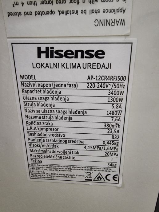 Prodajem vrlo malo rabljen prijenosni klima uređa Hisense model AP12CR4RFJS00. Može se isprobati ispravnost.