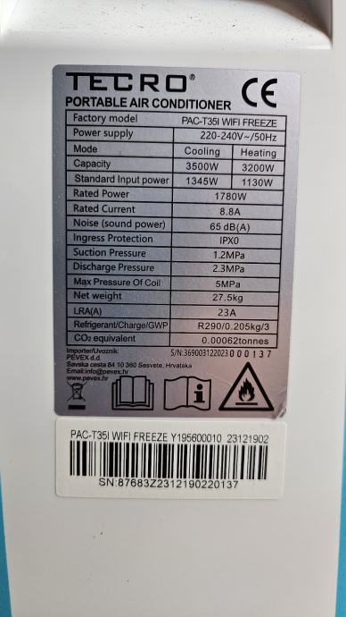Prijenosni klima uređaj Tecro 3,5 kW, star 1 godinu, hlađenje i grijanje, timer, spajanje na wi-fi, daljinski, malo korišten, stanje kao novo, povoljno