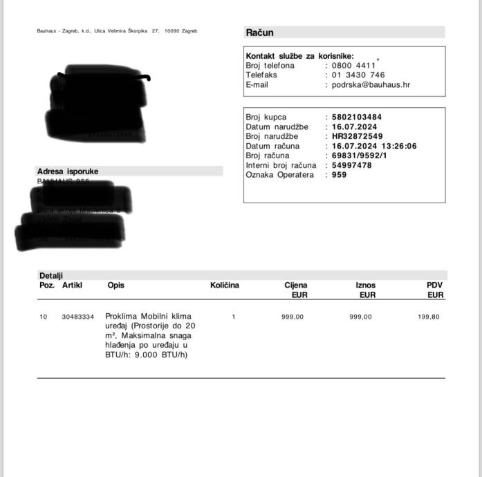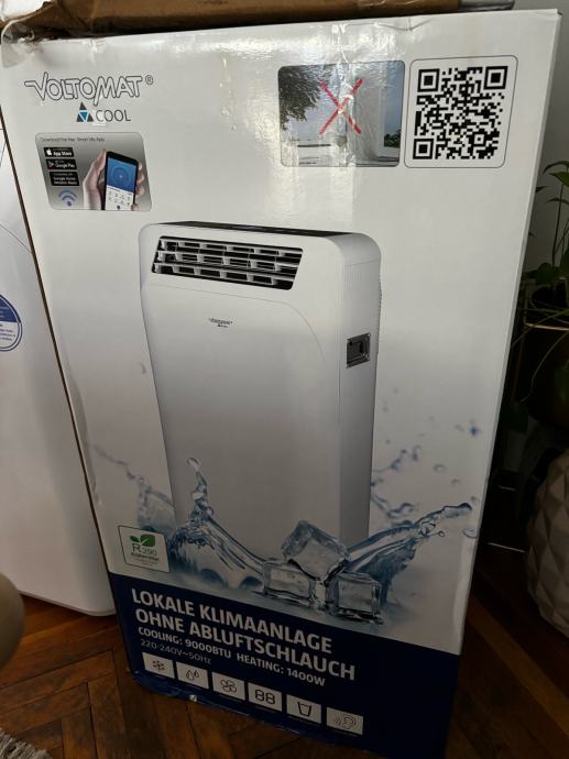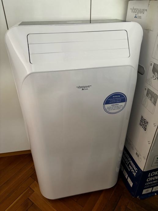 Mobilni uredjaj BEZ ISPUŠNE CIJEVI za prostorije do 20m2. Maksimalna snaga hladjenja u uredjaju 9.000 BTU/h. Hladi 8 h. Ima pretince za ledenice. Korišteno jednom jer nam nije odgovaralo za prostor u kojem se hladilo. Kupljeno u Bauhausu za 1000 eura.