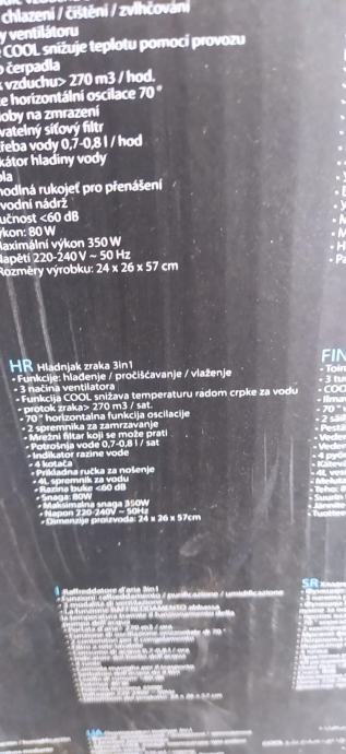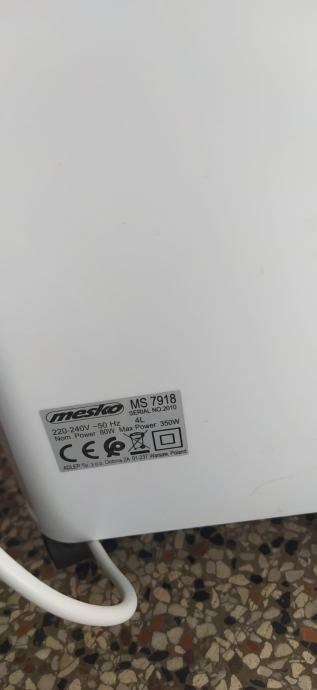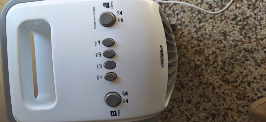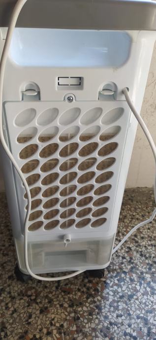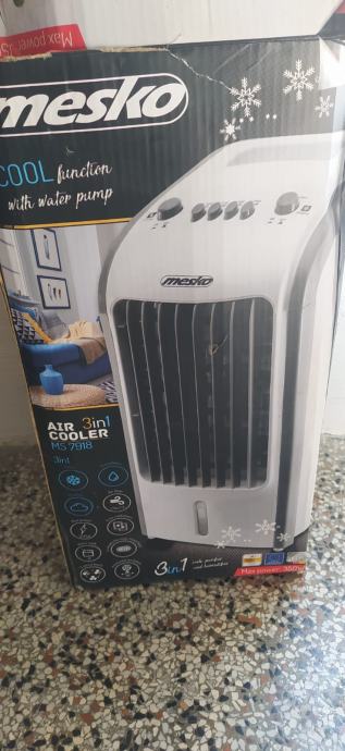 Prodajem rabljeni Mesko Air Cooler 3u1 rashladni uređaj. Radi se o mobilnom rashlađivaču zraka koji kombinira funkciju ventilatora, rashlađivanja i ovlaživača zraka uz vodenu pumpu. Uređaj je bijele boje, kompaktnih dimenzija, s upravljačkim gumbima na vrhu. Spreman za upotrebu.
