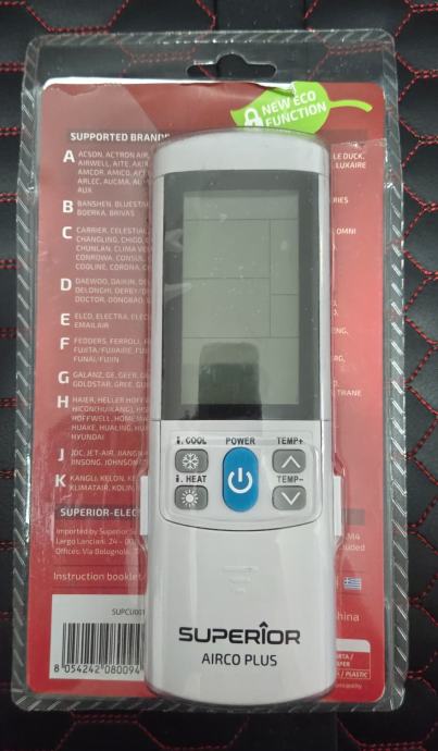 Prodajem potpuno novi, nekorišteni univerzalni daljinski upravljač za klima uređaje Superior AirCo Plus.