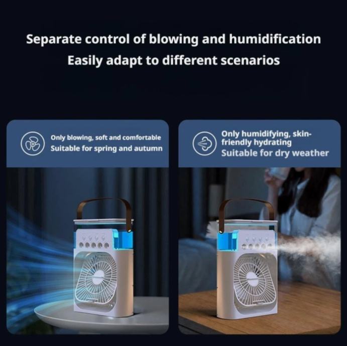 1. Dizajn tri u jednom, integrirajući funkcije ovlaživača zraka, ventilatora i malog klima uređaja, pružajući sveobuhvatno ugodno iskustvo za vaš dom.